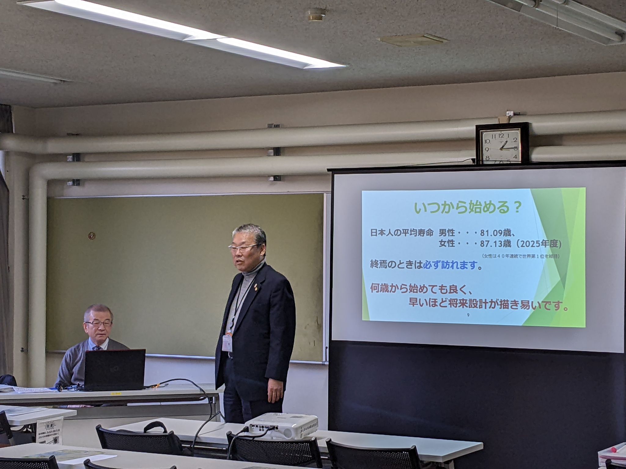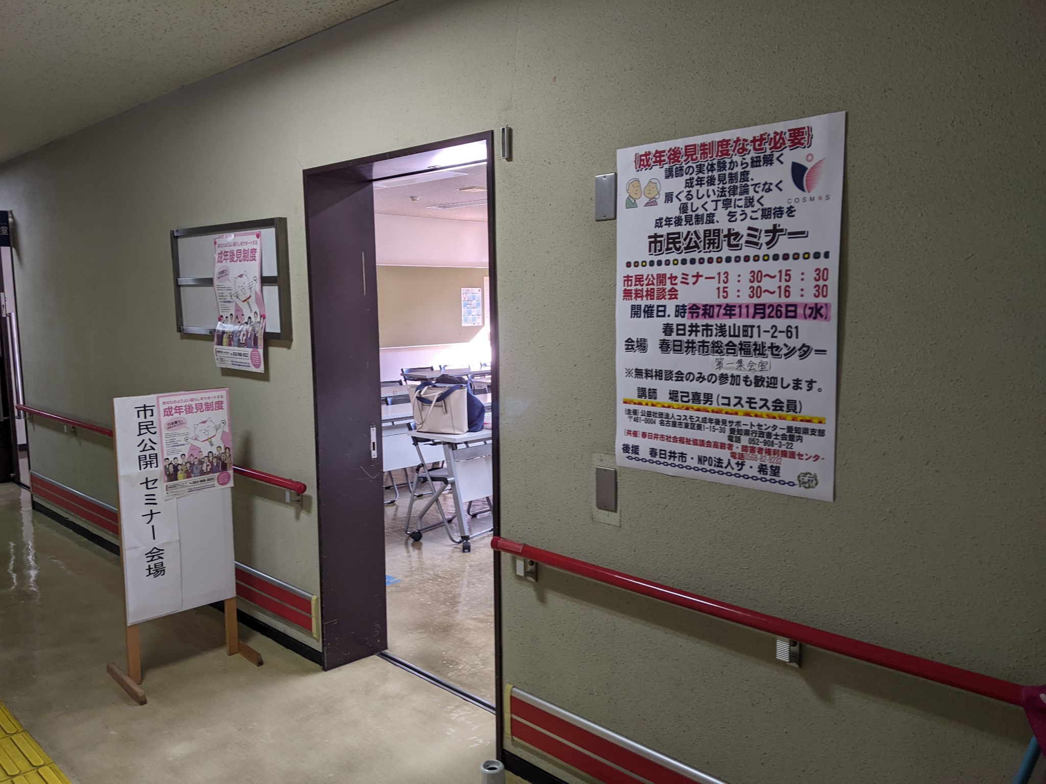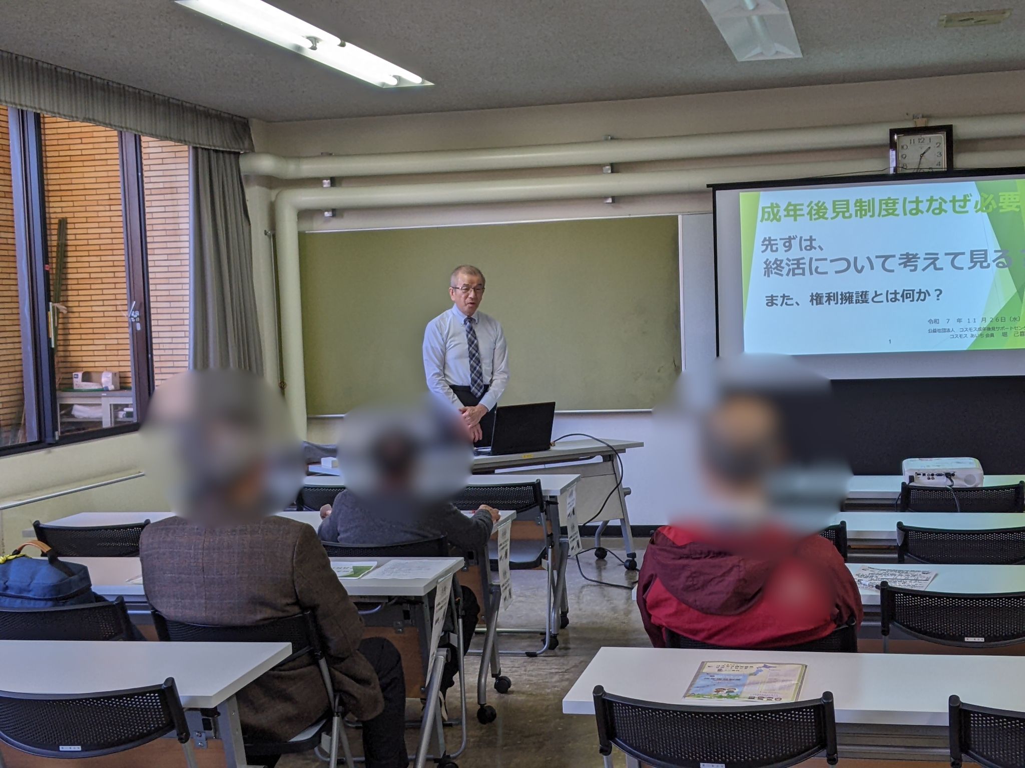 春日井市総合福祉センターにてセミナーと無料相談会を開催(11/26開催報告) イベント 2025.11.29 令和7年(2025年)11月26日(水)13:30~16:30春日井市総合福祉センターにてセミナーと無料相談会を開催いたしました。私たちコスモスあいちの会員である堀己喜男行政書士が、講師として、終活及び後見制度について分かりやすく説明しました。その後、15時30分から16時30分まで無料相談会を行いました。参加者は20名、その内、無料相談をされた方は2名いらっしゃいました。セミナー参加者の皆さんとても熱心に話を聞いてくださっており、メモをとりながら真剣に聞き入られておりました。